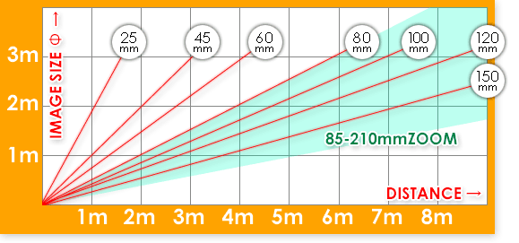 現下記の公式を使用すれば、あらゆる値に対して映像サイズまたは映写距離を計算することができます。(採寸はすべてmmで行って下さい) 例) 85mmレンズを使用した場合、映写面から3mの場所では、映像サイズはどのようになるか? 映写距離3000mm÷レンズの焦点距離85mm×被写体サイズ*40mm=映像サイズ1,412mmφ(1,412m)